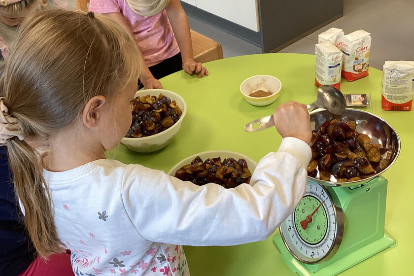 Es wurde entkernt, geschnippselt, gewogen, gekocht. Ist das nicht toll, wie aus Obst ganz einfach leckere Marmelade wird? Die kleinen Köchinnen und Köche waren mit Feuereifer dabei – beim Einkochen, aber natürlich auch danach beim Ausprobieren der hausgemachten Kinderinsel-Zwetschgenmarmelade. Schließlich schmeckt es gleich doppelt so gut, wenn man selbst mitgekocht hat!