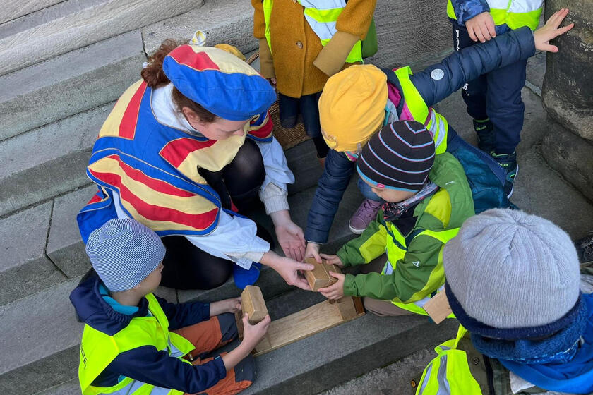 Zuletzt erkundeten die Vorschulkinder bei einer Stadtführung mit Ferdinand die historische Altstadt von Bamberg und ihre Geschichte: Ferdinand sollte eigentlich den Schatz des Kaiserpaares Heinrich und Kundigunda bewachen. Doch während er schlief wurden ihm die Kostbarkeiten gestohlen! Ehrensache, dass sich die kleinen Biber mit Ferdinand auf die Suche nach dem gestohlenen Schatz gemacht haben - von der alten Hofhaltung, über den Dom bis zum Pfahlplätzen. Überall gab es tolle Sachen zu entdecken: Wie baut man einen Torbogen ohne Mörtel? Wie hat man früher mit Feuersteinen und Stroh Feuer gemacht? Und wie schmeckt eigentlich Haferbrei? Natürlich wurde das alles gemeinsam mit Ferdinand auch direkt ausprobiert!