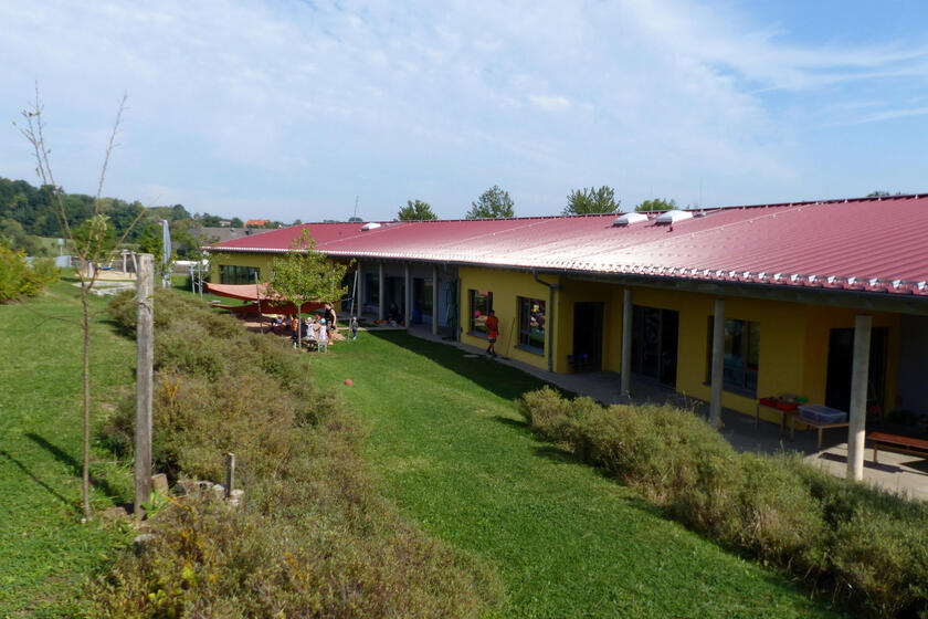Im großzügigen Außenbereich und rund um die Kinderinsel ist viel Platz für die Erkundung der Natur.