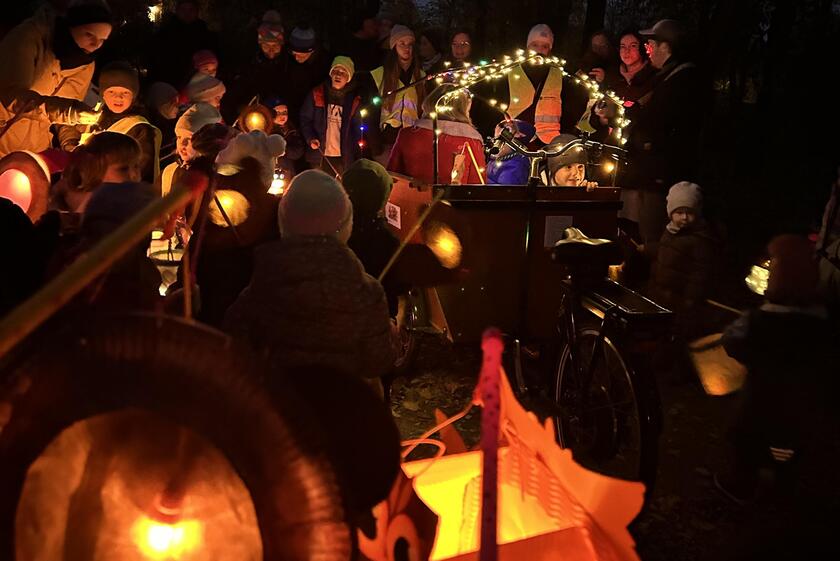 Mit dabei war natürlich auch der Ritter St. Martin - nicht auf einem Pferd sondern im geschmückten Lastenrad der Biberbande, das den Zug anführte. Nach dem Laternenumzug klang der Abend in der Biberbande mit Kinderpunsch, Glühwein und einem warmen Snack gemütlich aus.