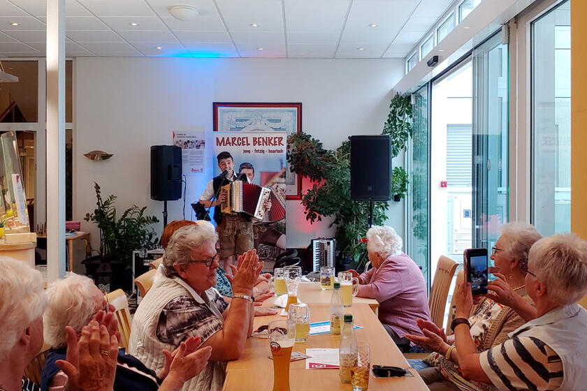 Bewohnerinnen und Bewohner des Betreuten Wohnens in der Peter-Rosegger-Straße feiern mit jungem Volksmusiker
