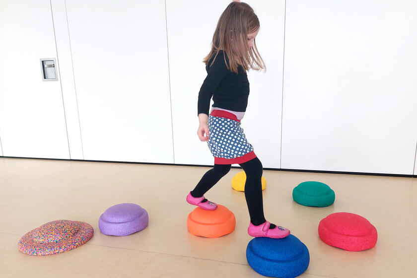 Die Kinder haben die robusten bunten Stapelkissen sofort in Besitz genommen: Die Steine fördern die Kreativität und Motorik der Kinder und lassen sich vielfältig einsetzen, sei es zum Balancieren, für Spiele wie „der Boden ist Lava“ oder einfach, um damit Türme zu bauen.
