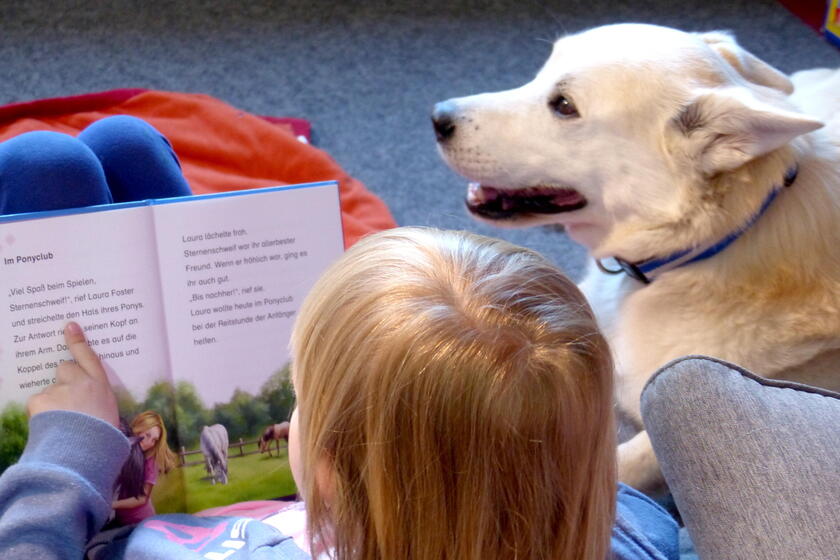 Vorlesen in entspannter Atmosphäre: Die Lesehunde hören ruhig und geduldig zu.