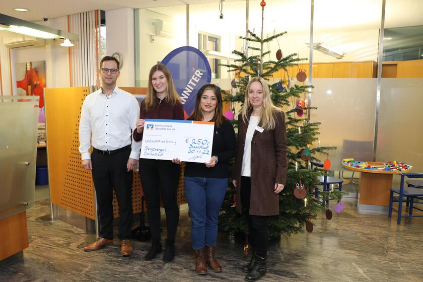 Bei dieser Gelegenheit überreichten Martin Wagner, Leiter der Geschäftsstelle Donaustauf der Raiffeisenbank Oberpfalz Süd eG und Servicemitarbeiterin Magdalena Schuß einen Spendenscheck über 250 Euro an Regine Rusin, Assistenz der Sachgebietsleitung Kindereinrichtungen bei den Johannitern in Ostbayern und Sinem Oral, Kinderpflegerin in der Johanniter-Kinderkrippe „Burgzwergerl“. Die Donaustaufer Raiffeisenbank spendet regelmäßig für soziale Projekte und jährlich auch eine Johanniter-Kindereinrichtung in der Marktgemeinde.