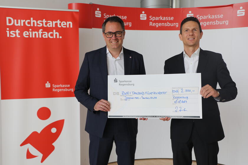Bei der offiziellen Spendenübergabe überreichte Helmut Haneder, Leiter des Bereichs Vorstandsunterstützung der Sparkasse Regensburg, einen symbolischen Spendenscheck an Matthias Walk, Sachgebietsleitung Marketing, Kommunikation, Vertrieb und Fundraising der Johanniter in Ostbayern.