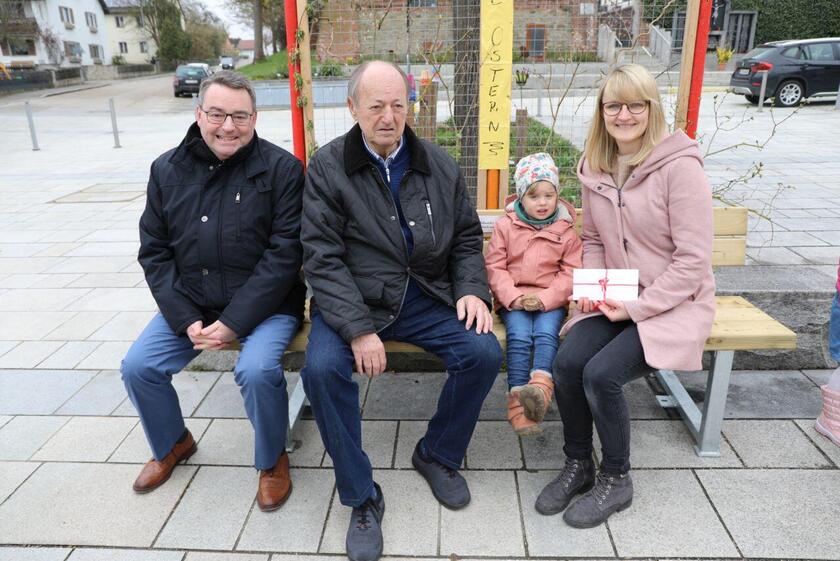 Alteglofsheim ■ Zu seinem 80. Geburtstag verzichtete der Alteglofsheimer Ehrenbürger Willi Schneider auf Geschenke. Stattdessen sammelte er Spenden für die lokalen Kindergärten in Alteglofsheim. Auf der ebenfalls für ihn gestifteten neuen Bank – dem „Willi Schneider Bankerl“ – fand am Mittwoch die Übergabe der Spenden statt.