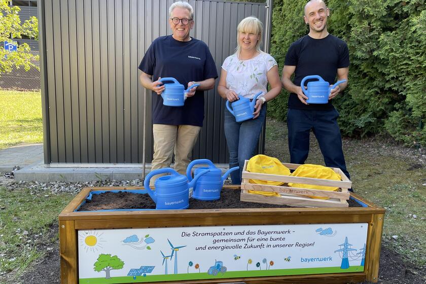 Eingefädelt hatte das Projekt Wolfgang Bübl. Er arbeitet beim Bayernwerk im Bereich Kultur & Organisation und engagiert sich im Elternbeirat der „Stromspatzen“, weil seine Tochter die Kinderkrippe besucht. „Ich finde es großartig, dass sich mein Arbeitgeber hier gezielt im Sinne des Jahresmottos ,Gesund und fit – alle machen mit‘ engagiert“, sagt Bübl. Die Kinder lernten so den kompletten Lebenszyklus von Obst und Gemüse vom Anpflanzen, übers Pflegen bis zum Essen kennen. Damit das Gießen der Pflanzen leichter fällt, hat das Bayernwerk auch noch ein paar Gießkannen sowie Sonnenhüte spendiert.