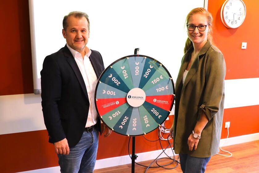 Bad Abbach ■ Am Dienstag erhielt die Johanniter-Krippe „Turmwichtel“ aus Bad Abbach 100 Euro bei der Glücksrad-Aktion der Asklepios-Klinik Bad Abbach. Bei der Aktion bekamen 24 Organisationen die Chance an einem Glücksrad zu drehen und somit ihren Gewinn in die eigene Hand zu nehmen. Die Institutionen wurden von den Mitarbeitenden der Asklepios-Klinik vorgeschlagen. Die Asklepios-Klinik wollte somit möglichst vielen Organisationen mit kleinen Spenden helfen anstatt eine einzelne Institution mit einem größeren Betrag zu unterstützen.