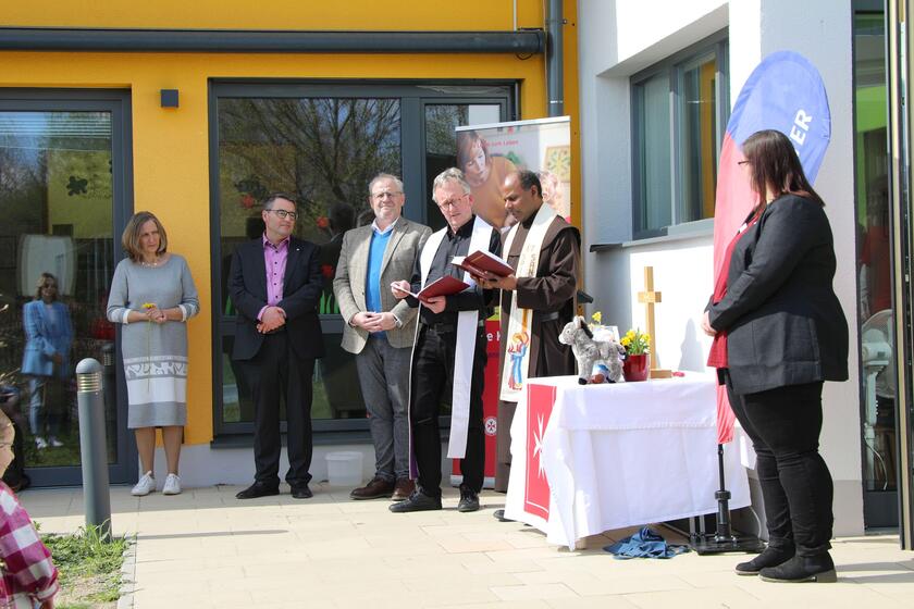 Aufgrund der hohen Nachfrage an Kinderbetreuungsplätzen in Schwandorf war der Anbau dringend notwendig geworden. Die neu hinzugekommenen Plätze sind auch bereits belegt. Martin Steinkirchner, Regionalvorstand der Johanniter in Ostbayern, dankte der Stadt Schwandorf im Rahmen der Eröffnung, „für die stets gute Zusammenarbeit und vor allem auch dem Betreuungsteam im Kinderhaus für die hervorragende Arbeit mit den Kindern, die sie hier täglich leisten“. Im Anschluss überreichte er dem gesamten Team um Kinderhausleitung Sandra Dollmann Blumen und ein Wimmelbuch für die neue Kindergartengruppe. Sichtlich erfreut waren auch die Kinder, die zur Einweihungsfeier ein Lied vortrugen - begleitet von Gitarrenmusik. Auch Schwandorfs Oberbürgermeister Andreas Feller sprach ein Grußwort an die versammelten Gäste und wies dabei auf die Notwendigkeit des Anbaus hin. Er wünschte den Kindern und dem Betreuungsteam in den neuen Räumlichkeiten und dem neuen Gartenbereich viel Freude, ehe Diakon Jürgen Weich von der Evangelisch-Lutherischen Kirchengemeinde Schwandorf und Pater Francis Lawrence von der katholischen Kirchengemeinde „Unsere Liebe Frau vom Kreuzberg“ in Schwandorf den christlichen Segen spendeten.