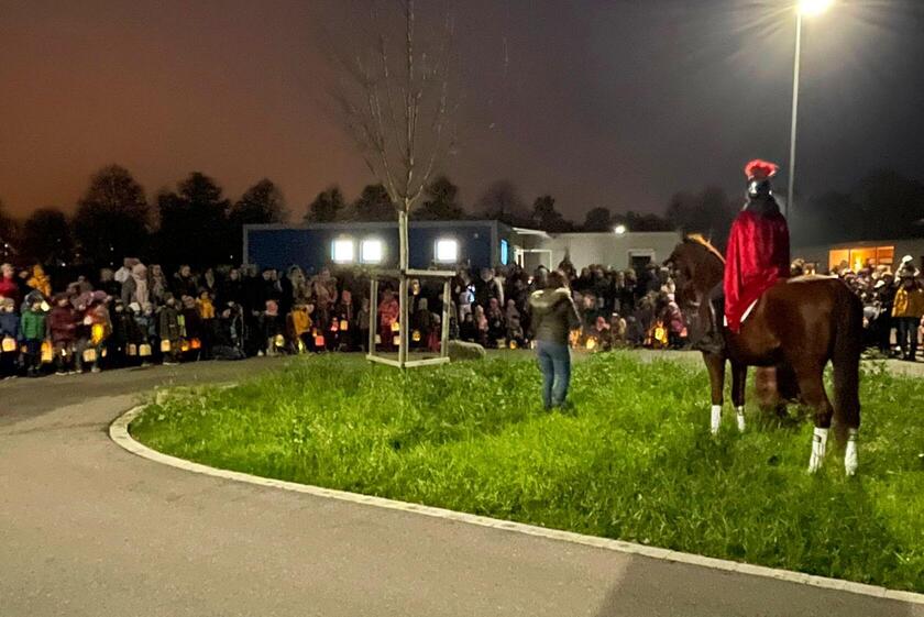 Die fünf Kindergartengruppen haben sich zuerst in ihren Gruppenräumen versammelt. Anschließend trafen sich alle Kinder mit den Eltern am Wendehammer vor dem Kinderhaus. Dort warteten St. Martin auf seinem Pferd und auch der Bettler. Hier wurde dann die Legende des heiligen St. Martin nacherzählt und ein gemeinsames Gebet gesprochen. In einem großen Martinszug folgten die Kindergartenkinder mit ihren Laternen St. Martin auf seinem Pferd. Die Eltern warteten an der Seite, um das Lichtermeer der Laternen zu begutachten. Die Krippenkinder zogen gemeinsam mit ihren Eltern bei guter Stimmung und gemeinsamem Singen hinter den Kindergartengruppen her.