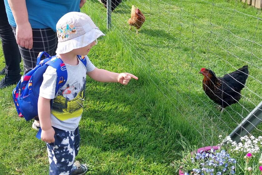 Nach der Ankunft am Hof sammelten die Kinder fleißig Futter für die Tiere. Anschließend durften die „Küken“ dann die Hühner füttern. Auch die Ziegen, Hasen und Schweine wurden von den Kindern kulinarisch verwöhnt. Im Anschluss gab es eine Brotzeit, zu welcher der Kleintierhof ein Ei für jedes Kind beisteuerte. Daraufhin hatten die Kinder Zeit, den Hof noch weiter zu erkunden. Abschließend gab es noch ein Picknick.