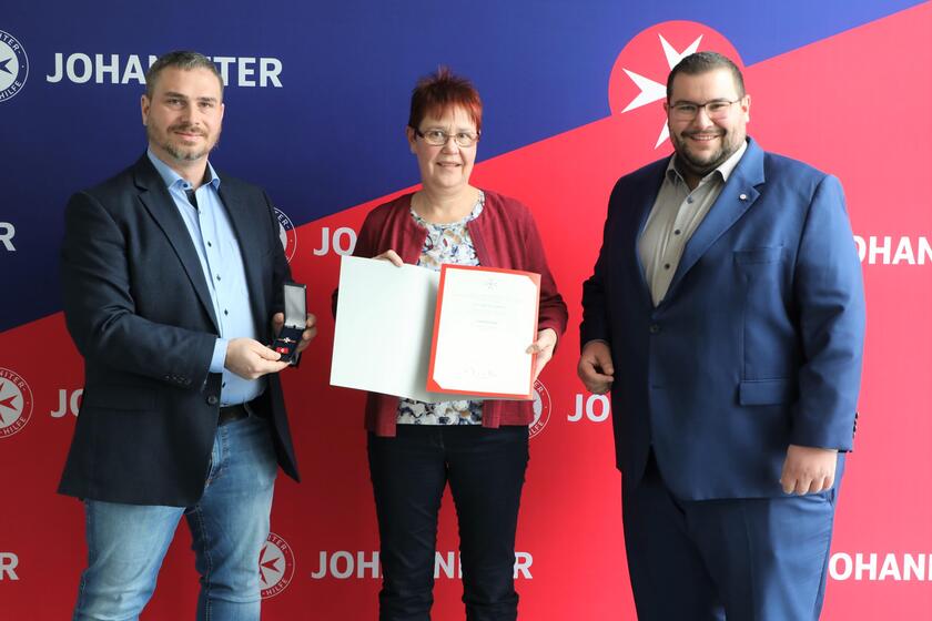 Unter dem Vorwand eines Austauschgesprächs luden Regionalvorstand Tobias Karl und der Regensburger Ortsbeauftragte Oliver Braun die ehemalige Leiterin des KITs zu sich in die Regionalgeschäftsstelle. Sichtlich überrascht, freute sie sich über die Anerkennung ihrer Leistung. „Vielen Dank für die netten Worte und das Johanniter-Ehrenzeichen. Mir ging es aber nie um irgendwelche Auszeichnungen oder Orden, der Dienst am Menschen steht bei mir immer an vorderster Stelle“, so die bescheidene Ehrenzeichenträgerin.