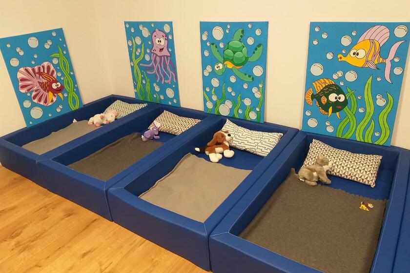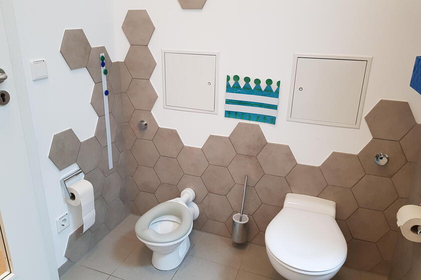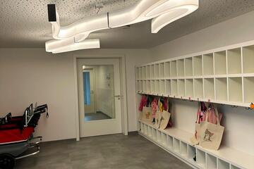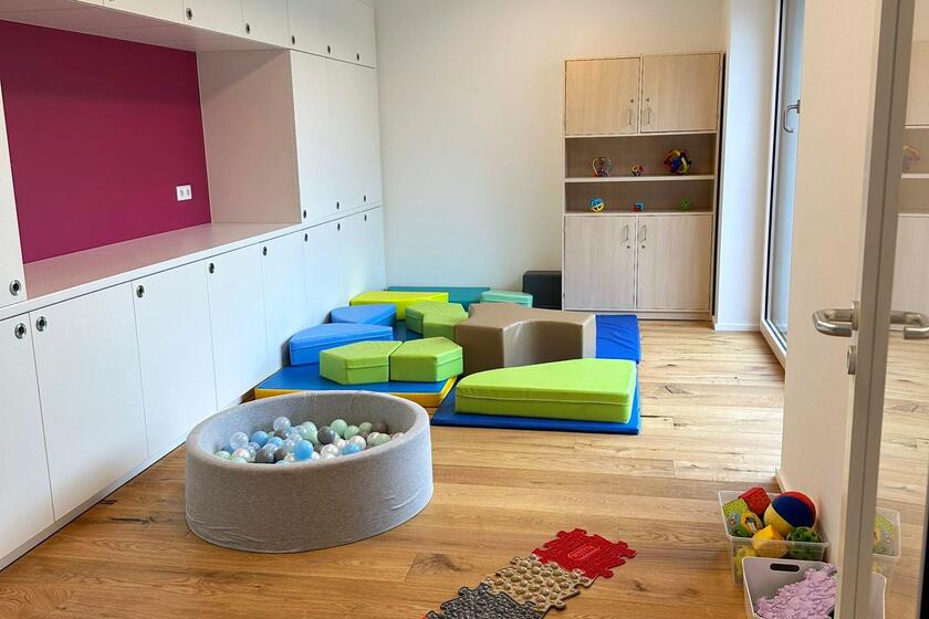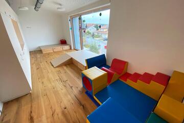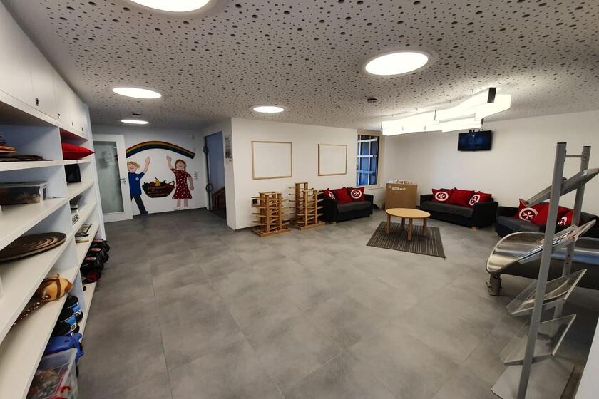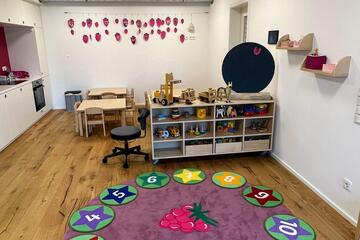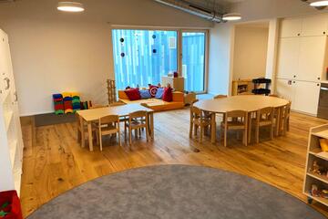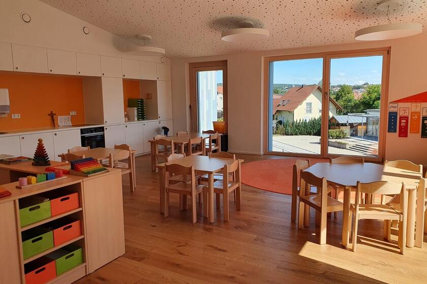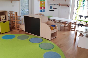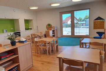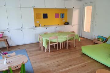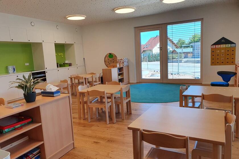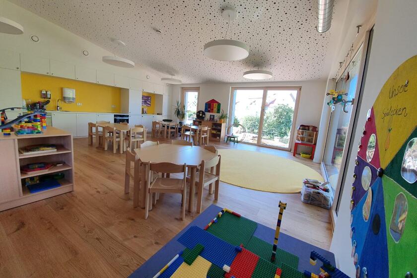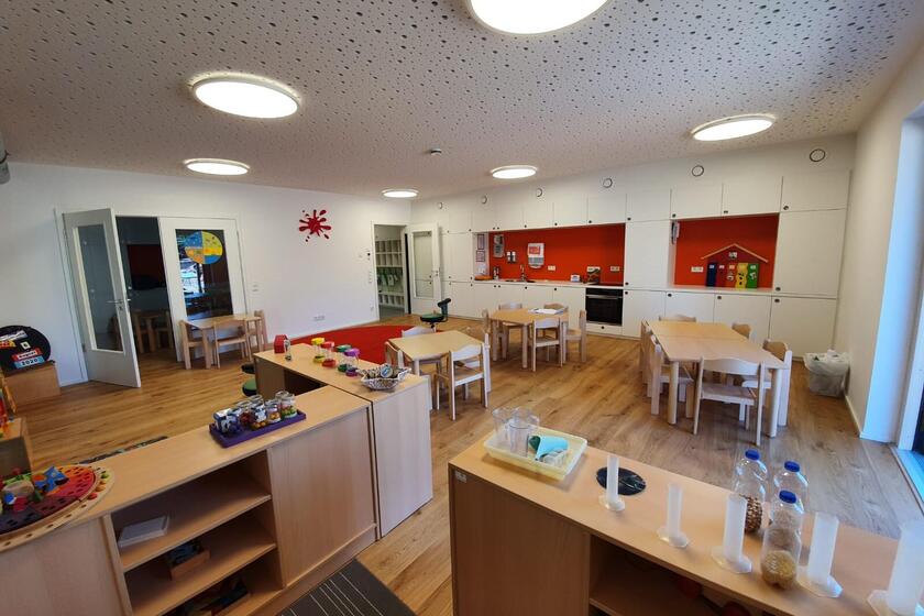 Das Kinderhaus bietet Platz für 24 Krippen- und 125 Kindergartenkinder in fünf Kindergartengruppen und zwei Krippengruppen.