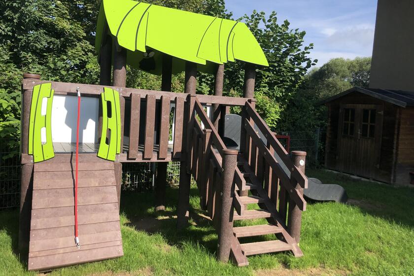 Der Garten ist von beiden Gruppenräumen direkt zu erreichen. Hier haben die Kinder Platz zum Toben, Rennen und Spielen. Dort befinden sich ein Außenglockenspiel, eine Vogelnestschaukel, eine Balanciertreppe, ein Spielhaus mit Rutsche, zwei Wipptiere, zwei Motorikwände, ein kleines Gartenhäuschen und ein Sandkasten.