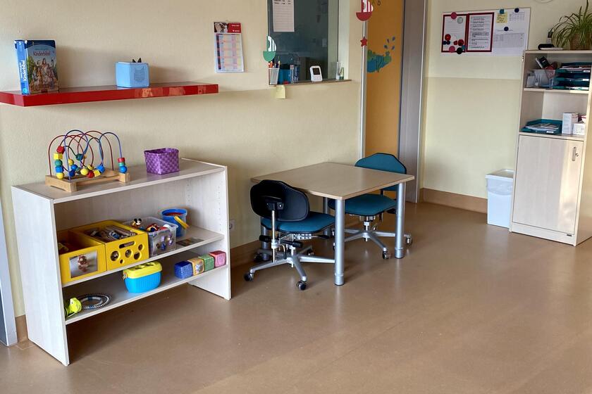 Das Kinderbadezimmer gliedert sich ebenfalls direkt an den Gruppenraum an. Es ist mit einer Wickelkommode mit Badewanne, mit zwei Kindertoiletten und zwei Waschbecken ausgestattet. Auch ein Schrank für Windeln und Wechselwäsche der Kinder ist vorhanden.