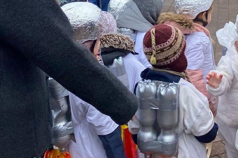 Ausgestattet mit Düsenantrieb, Weltraumanzug, Space-Medaillen und lauten außerirdischen Rasseln und Trommeln wurde sich auf den traditionellen Krachmacherzug bestens vorbereitet. Bereits in den frühen Morgenstunden ist die Astronautengruppe im Johanniter Hort Weltenbummler gelandet, da die Anreise aus dem Wald viele, viele Lichtjahre entfernt war. Gemeinsam mit der Kita Erdenstern setzte sich der Zug um 11:11 Uhr in Begleitung mit einigen Elferräten und Senatoren der Eigenheimer in Bewegung. Laut ging es in den Straßen umher und niemand konnte die Kinder überhören. Verstärkung bekamen die Astronauten am Günterslebener Kettenbrunnen, als sich der Johanniter Naturkindergarten mit weiteren Elferräten und Kolpingmitgliedern dem Zug angeschlossen haben. Als letzte Gruppe schlossen sich die Kinder der Villa Kunterbunt dem Zug an, die bereits am Feuerwehrplatz sehnsüchtig auf die Krachmacher warteten. Danach wurde gefeiert, getanzt und noch mehr Krach gemacht, bis auch die letzten Faschingsmuffel auf die kleinen Narren aufmerksam wurden. Abschließend gab es für die Kinder noch Kastanien, Wienerle und einen Krapfen, um sich für die Heimreise zu stärken.
