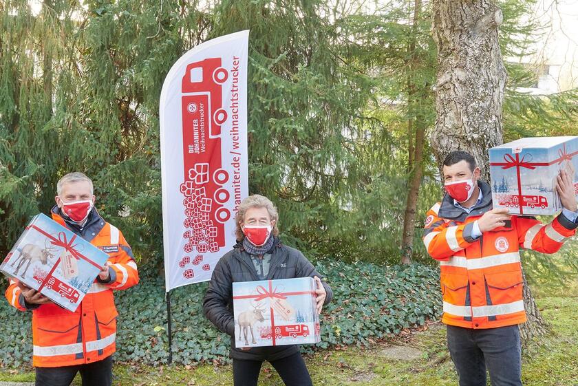 Vor zwei Jahren war Peter Maffay live bei der Verabschiedung der Johanniter-Weihnachtstrucker in Landshut mit dabei gewesen. Dieses Jahr findet der Abfahrtsevent coronabedingt nicht statt. Daher übergab der Musiker sein Paket direkt an Andreas Hautmann, hauptamtliches Mitglied des Landesvorstandes der Johanniter in Bayern und an Ulrich Kraus, Projektleiter Johanniter-Weihnachtstrucker.