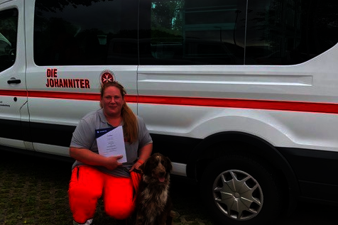 fachliche Verstärkung in unserem Team haben“, freut sich Andreas Ebeling, Zugführer der Rettungshundestaffel der Johanniter in Schweinfurt. Zahlreiche Ausbildungen und Übungen durchlief Stettner in den letzten drei Jahren und investierte ihre Freizeit in die Ausbildung des Australian Sheperd-Mix, bevor sich das Team zur Prüfung angemeldet hat. Kaum in Kempten angekommen, starteten sie am frühen Sonntagmorgen mit einer theoretischen Prüfung der Hundeführer aus ganz Deutschland. „Uns wurden Fragen zur Einsatztaktik, Erster Hilfe an Mensch und Hund, Wetterkunde sowie zu Karte und Kompass gestellt, die ich zum Glück alle