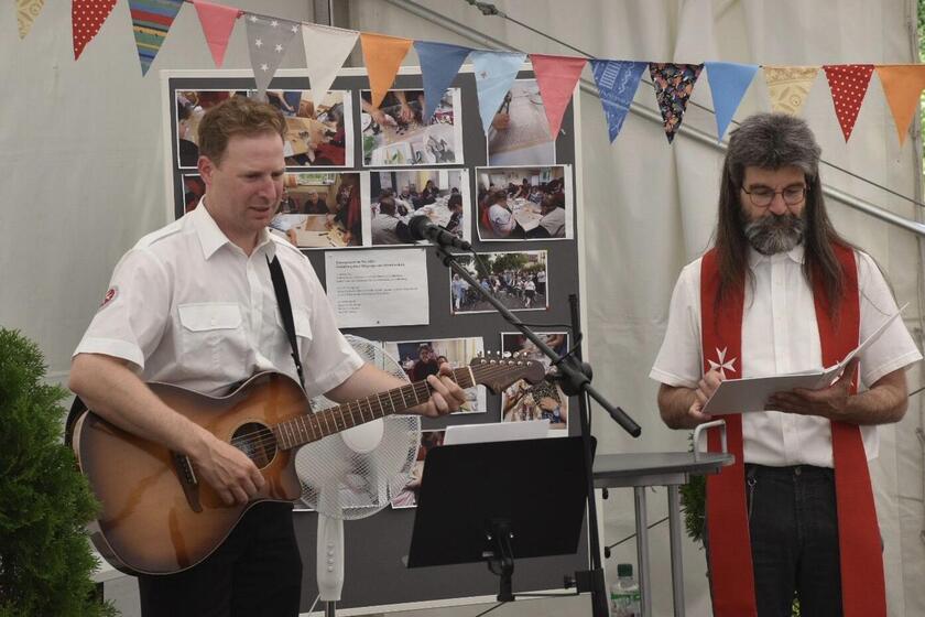Die Festgäste und Mitarbeitenden der Johanniter starteten in einen abwechslungsreichen Nachmittag, in dem Johanniter-Standortpfarrer Lutz Domröse mit einer lebendigen Andacht alle Anwesenden begrüßte und anschließend segnete. Uwe Kinstle, Mitglied des Regionalvorstandes der Johanniter in Unterfranken, dankte in seiner Ansprache den Förderern und allen aktuellen Akteuren für ihre hervorragende Arbeit. Ein besonderes Dankeswort sprach er zudem an Dienststellenleiter David Hettiger aus, der die Johanniter nach 10 Jahren verlassen wird, um sich beruflich nochmals weiterzuentwickeln. „Herzlichen Dank für die sehr gute Zusammenarbeit“, so die Würdigung seines Vorgesetzten, welcher das Ausscheiden sehr bedauerte, gleichwohl gutes Gelingen für die Zukunft wünschte.
