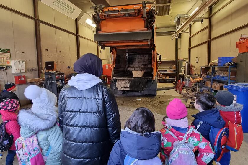Bei dem Besuch wurde den Kindern anfangs die Funktionsweise eines Müllfahrzeuges genau erläutert. Das Innere des Müllwagens ist, zum Erstaunen der schlauen Mäuse, mit einer riesigen Presse ausgestattet, welche den Abfall kleinstmöglich zusammendrückt, denn der Laderaum des Fahrzeugs sollte bestenfalls prall gefüllt sein, bevor er auf der Deponie entleert wird. Je nach Abfallsorte, wird das Fahrzeug anschließend bei der Verwertungsanlage oder der Verbrennungsanlage entleert.