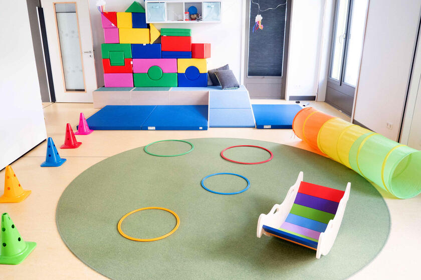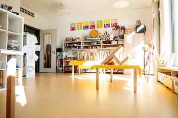 Zum Spielen laden in der Kindestagestätte die verschiedenen hingebungsvoll eingerichteten Bereiche ein: wie z. B. ein großer Bastel-/Kunstraum, Bewegungsräume, ein Werkraum sowie ein Raum für Rollenspiele. Die Bereiche für die Nestgruppen und für die größeren Kinder sind voneinander getrennt, aber über ein Foyer verbunden, das in Zukunft auch als Elterntreff dienen wird.