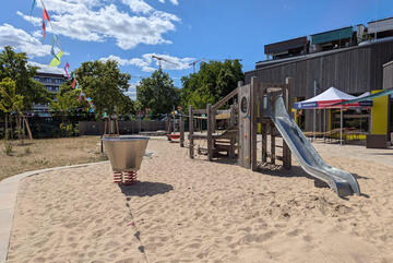 Eine weitere Besonderheit der Kita ist der Blick auf den Hubschrauberlandeplatz des Bundeswehrkrankenhauses, der sicherlich viele Kinderherzen höherschlagen lässt.