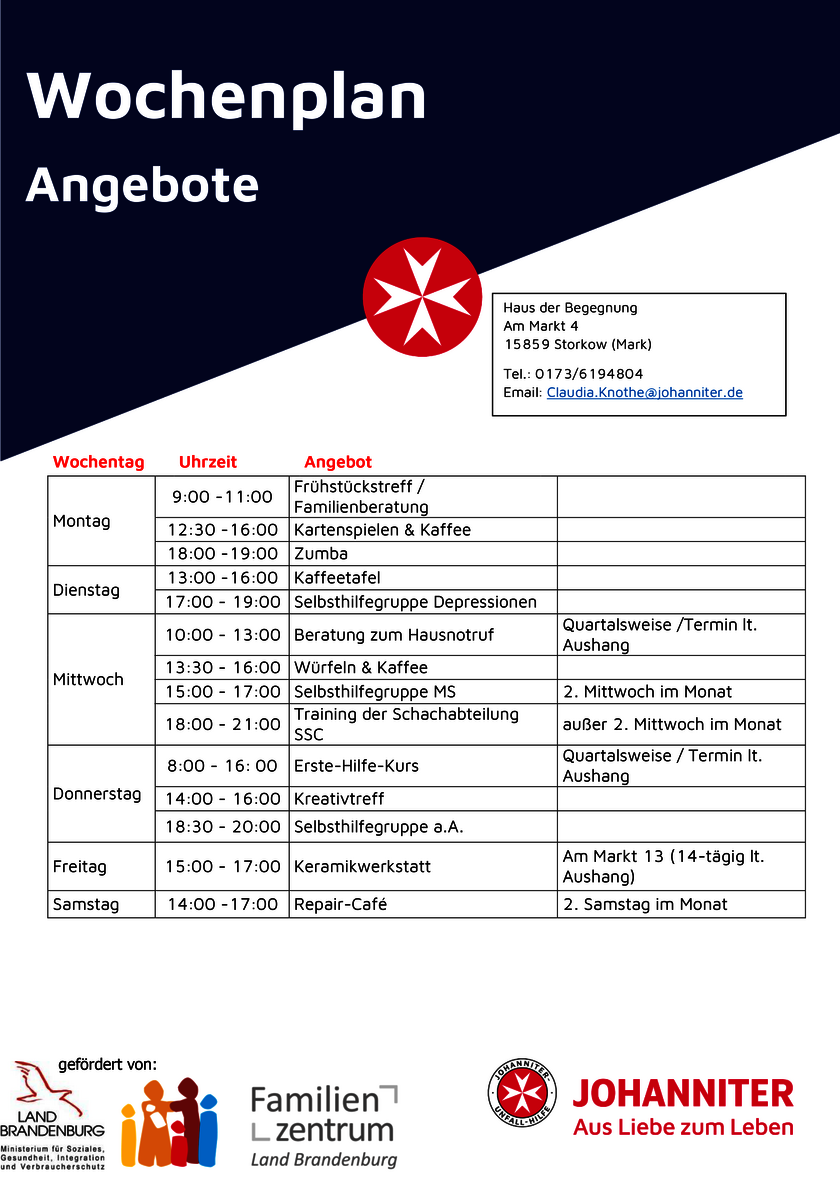 Das Haus der Begegnung bietet Möglichkeiten der Teilhabe am Leben zu schaffen und soziale Isolation zu vermeiden. In Zusammenarbeit mit dem Seniorenbeirat und der Stadt Storkow, werden die Johanniter die bestehenden Angebote erhalten und weiter ausbauen. 1/3 der Storkower Einwohner sind Senioren, insofern kommt dieser Bevölkerungsgruppe eine besondere Bedeutung zu. Auch die Begegnungen verschiedener Generationen, Interessengruppen und Hilfesuchender sind Zielstellungen dieses besonderen und traditionsreichen Ortes.
