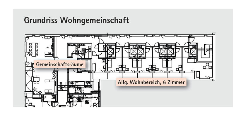 Auf jeden Mieter der Wohngemeinschaft entfällt eine Wohnfläche von knapp 42 m². Jedem Bewohner steht ein eigenes Zimmer mit eigenem Duschbad und WC von ca. 20 m² zur Verfügung, welches selbst möbliert und eingerichtet werden kann. Alle Räume der WG befinden sich auf einer Ebene im 2. Obergeschoss und sind barrierefrei und mittels Aufzug zu erreichen. Die Wohnküche und die anderen Gemeinschaftsräume sind voll- bzw. teilmöbliert. Lichtausstattung sowie Hausnotrufgeräte sind vorhanden.