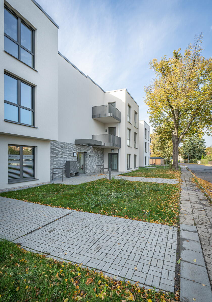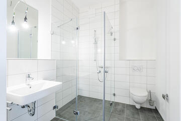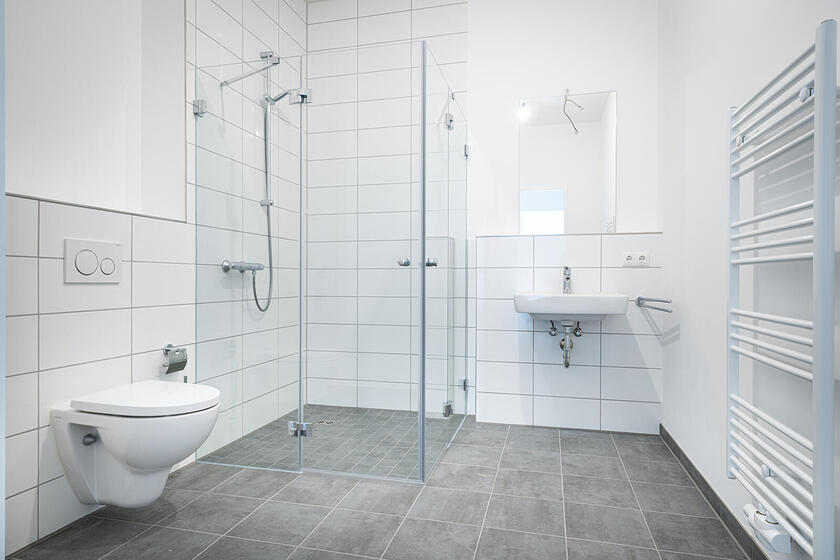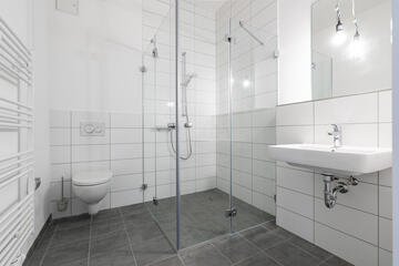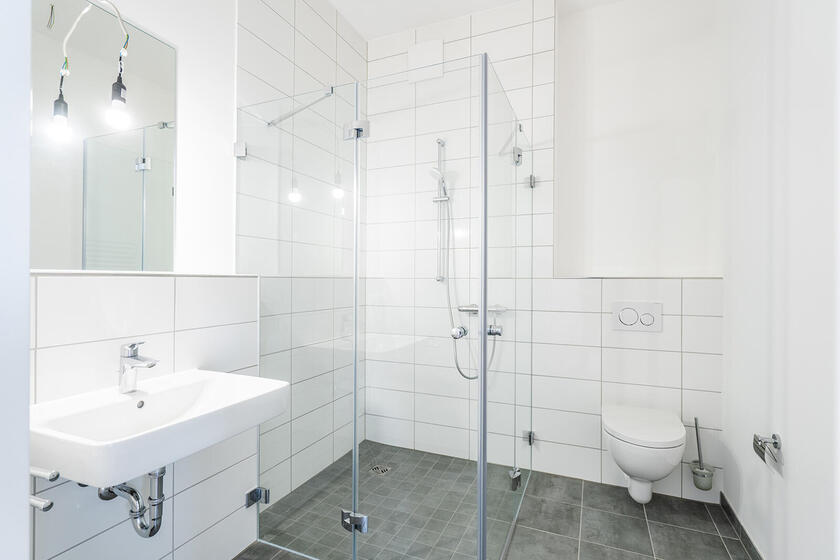- stilvolle Bäder mit bodengleicher Dusche; weiße Marken-Sanitärobjekte (wandhängendes Tiefspül-WC, Waschtisch, verchromte Armaturen); davon 5 Rollstuhlbäder und 1 Behinderten-WC