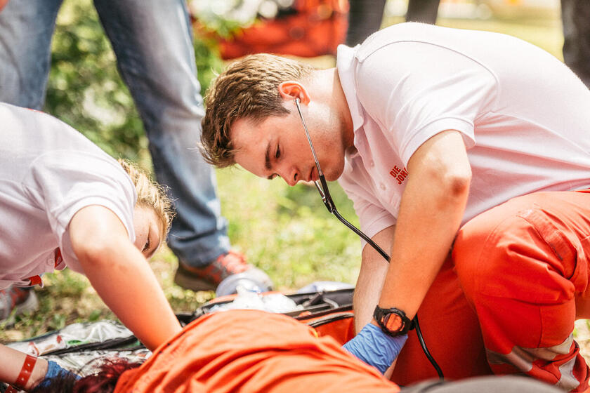 Gemeinsam mit Rettungshelferinnen und Rettungshelfern sowie Rettungssanitäterinnen und Rettungssanitätern übernimmst du die Erstversorgung. Dein Einsatz reicht von kleineren Verletzungen wie Schürfwunden bis hin zur Unterstützung bei Kreislaufproblemen oder anderen medizinischen Notfällen.