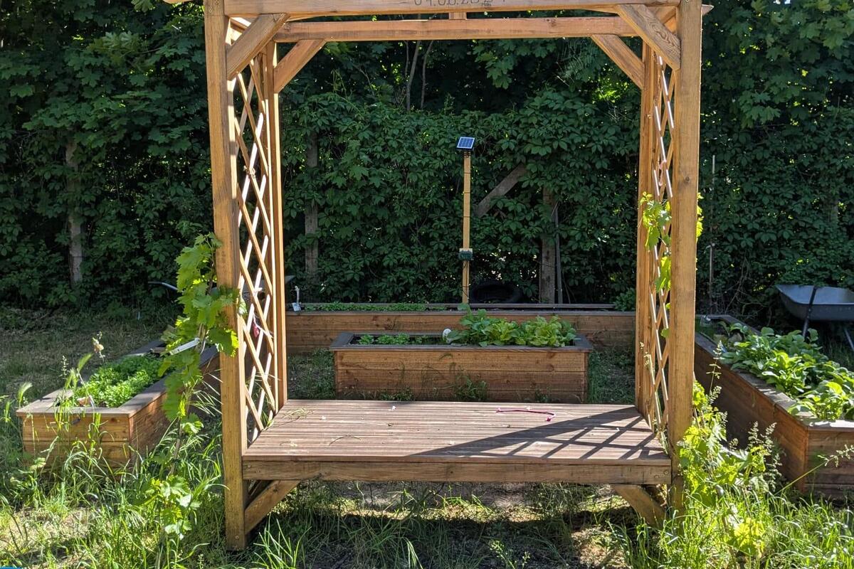 Um den Kreislauf der Natur unmittelbar wahrzunehmen, gestalteten wir unseren Garten weiter und es entstanden neben den „Ausprobier-Beeten“ auch Hochbeete für Gemüse mit Solarbewässerung, Kräuterbeete, Blumenbeete, Naschbeete, Obstbäume und eine Weinlaube. Die Kinder teilten ihre Wünsche mit, welche Obst- und Gemüsesorten sie in ihrem Garten pflanzen möchten. Ein Beet zum freien Experimentieren nutzen die Kinder, um selbst zu entscheiden, was dort gepflanzt und gesät wird. Ebenfalls zum Garten gehören Blumenbeete. Hier integrierten wir weitere Sitzplätze, von denen Blütenpracht und Insektengewimmel beobachtet werden kann. Das Insektenhotel kommt den Wildbienen zugute. Neben den Beeten erschufen wir Bereiche, die sich selbst überlassen bleiben und vor uns Menschen geschützt werden. Vogeltränken, Futterstellen und Nistkästen wurden angebracht. Wir schafften uns Gartengeräte an, zu denen die Kinder jederzeit Zugriff haben. Außerdem kauften wir Becherlupen, Ferngläser sowie Bestimmungsbücher.
