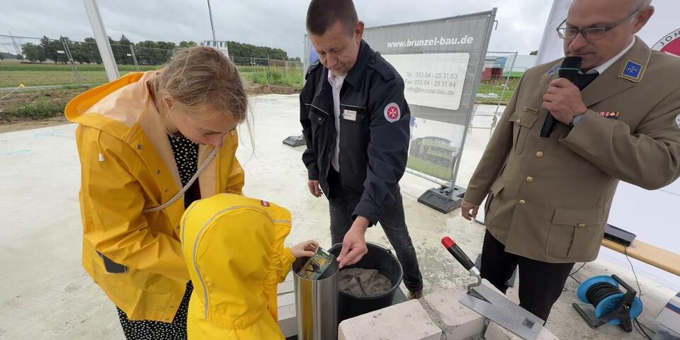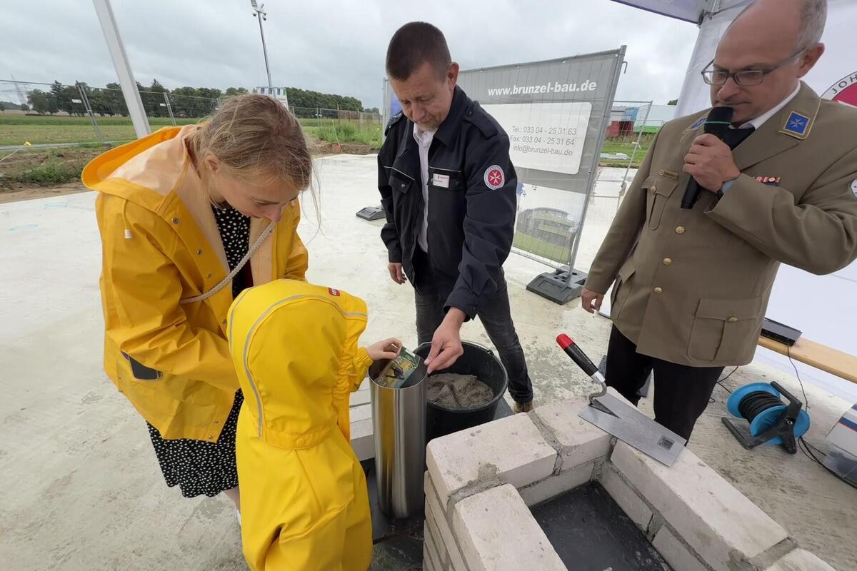 Gemeinsam wurde die Schatulle mit der aktuellen Tageszeitung, Münzen, den Bauplänen und einigen Kinderspielzeugen befüllt. Bürgermeister Geppert, der stellvertretende Ortsvorsteher Nils Grothe und die Johanniter-Regionalvorstände Ralf Opitz und Dietrich von Buch mauerten die Kapsel anschließend in einen vorbereiteten Schacht ein.