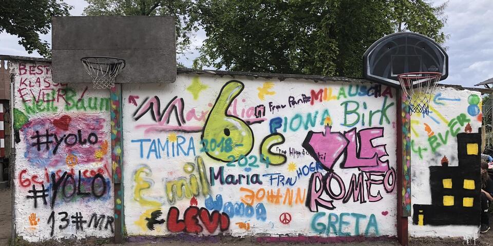 Ziemlich cool, wenn man sieht, mit welcher Freude die Schülerinnen und Schüler der 6. Klassen das zuvor im Kunstunterricht Gelernte praktisch umsetzen. Den eigenen Namen ganz groß auf eine Wand sprühen und zu wissen, das bleibt nun für ein ganzes Jahr sichtbar, macht Spaß und ist ein tolles Zeichen des Abschieds. Man geht, aber etwas bleibt als Erinnerung zurück.