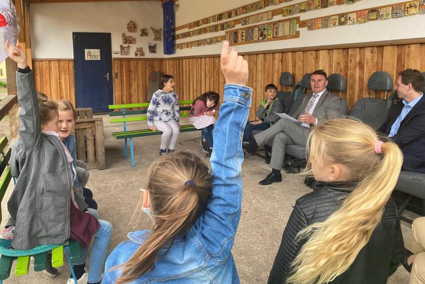 Marion Daht und Manja Seidel vom Förderverein der Schule begrüßten den Diplomaten gemeinsam mit Martin Hoeck, dem Vorsitzenden der Hoeck-Stiftung, am Vormittag auf dem Gelände der Ganztagsschule. Der Botschafter besichtigte unter Berücksichtigung der aktuell geltenden Hygieneregelungen die Einrichtung am Kupferhammerweg inklusive des im letzten Jahr fertiggestellten Erweiterungsbaus und stellte sich den vielfältigen Fragen von acht Schülerinnen und Schülern der dritten und vierten Klasse. Diese wollten nicht nur wissen, welche Aufgaben und Pflichten ein Botschafter hat, sondern erfuhren auch mehr über das Land Slowenien, welches seit 2004 Mitglied der Europäischen Union ist. So erzählte der Diplomat, dass Kinder in Slowenien bereits mit Beginn der Grundschulzeit Fremdsprachen wie Englisch und auch Deutsch lernen.