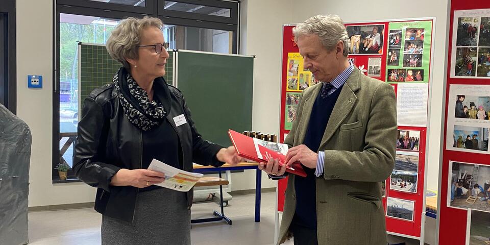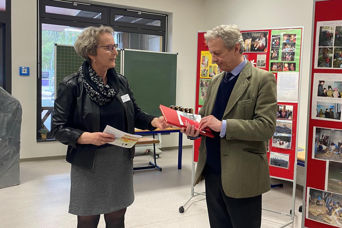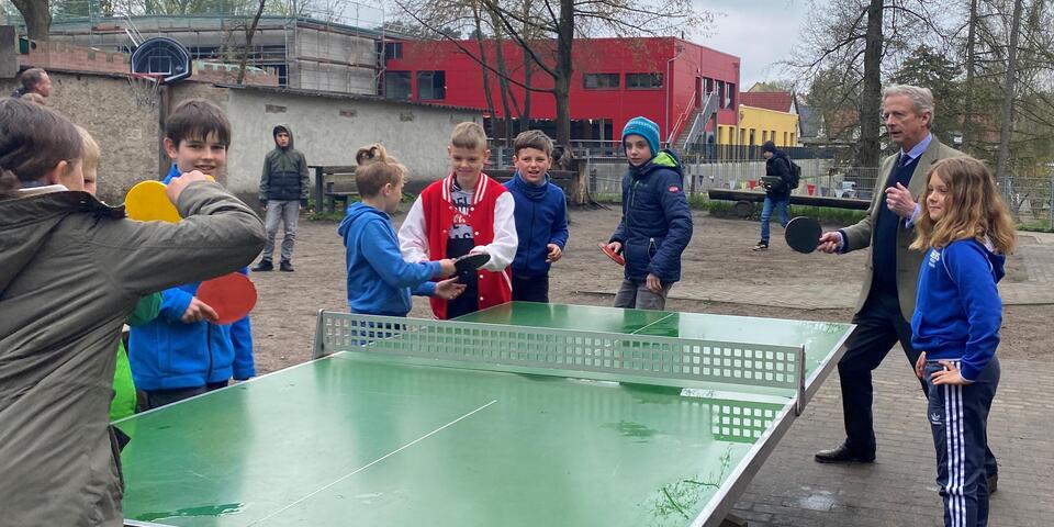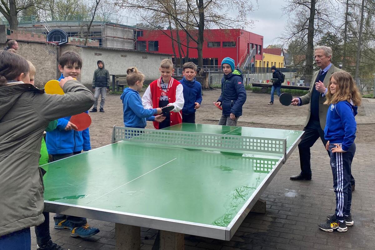 In Begleitung der Landesvorstandsmitglieder David Kreuziger und Götz-Georg von Randow wurden die Gäste in der Geschäftsstelle von den Regionalvorständen Ralf Opitz und Dietrich von Buch sowie vom Barnimer Landrat Daniel Kurth und dem Eberswalder Bürgermeister Götz Herrmann begrüßt. Anschließend besichtigte der Herrenmeister mit Begleitung die Kinderakademie. Nach einer kleinen Aufführung der Theater-AG, die einen Teil ihres Osterstücks vorführten, ging es in die Klasse 2a, die viele Fragen an den Prinzen hatte. Und auf dem Rückweg ließ es sich der hochkarätige Besucher nicht nehmen mit den Kindern eine Runde Tischtennis zu spielen.