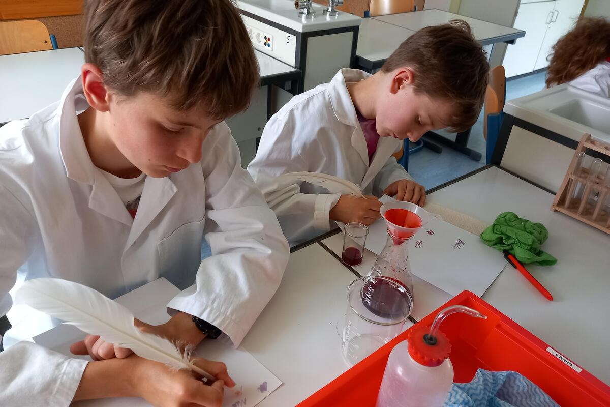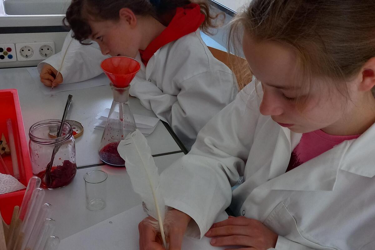 Dann wollten alle Kinder genau das ausprobieren. Wir ernteten also nicht nur Brombeerzweige für unsere Haustiere, sondern auch gleich Mohnblumenblüten. Diese setzten wir mit Haushaltsessig in Schraubgläsern an und stellten sie in die Sonne. Als wir uns eine Woche später wieder zum naturwissenschaftlichen Neigungsunterricht trafen, filterten die Kinder das Gemisch und probierten das Schreiben mit der entstandenen roten Tinte aus. Auf dem Papier erschien diese in einem wunderschönen Violett, nach dem Trocknen wird die Tinte braun bis schwarz.