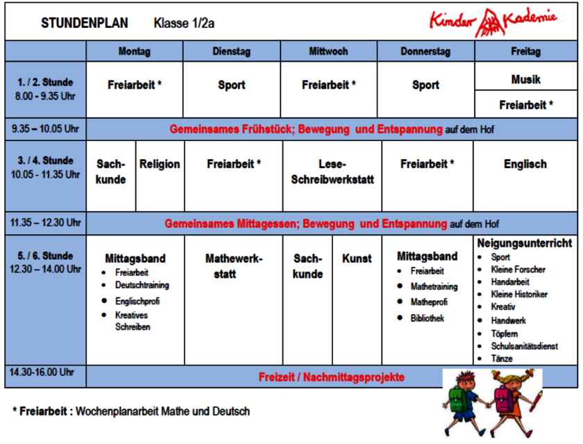 Besonderen Wert legen wir auf einen rhythmisierten Tagesablauf. Das heißt, die Schülerinnen und Schüler erleben eine sich täglich wiederholende Tagesstruktur, die Sicherheit und Gelassenheit für anstehende Aufgaben gibt. Unser Stundenplan weist meist Doppelstunden aus. In diesem Blockunterricht können sich Schüler und Lehrer fächerübergreifend, mit größter Intensität den jeweiligen Unterrichtsinhalten widmen. In den zwei langen Pause essen wir gemeinsam und spielen bzw. entspannen uns auf unserem schönen Schulhof.