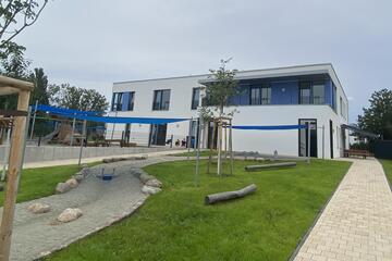 Die großzügigen Außenflächen und Gärten runden das moderne Angebot ab: Neben einer Matschküche und einem Wasserspielplatz gibt es einen Sauna- und einen Naschgarten, Kletterbereiche, Fahrstrecken, eine Seilbahn, eine Bewegungsbaustelle und einen Fußpfad. Diese vielfältigen Spielplätze bieten den Kindern zahlreiche Möglichkeiten, sich auszuprobieren.