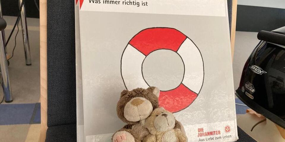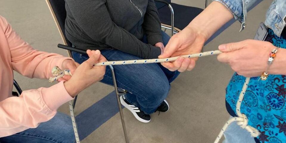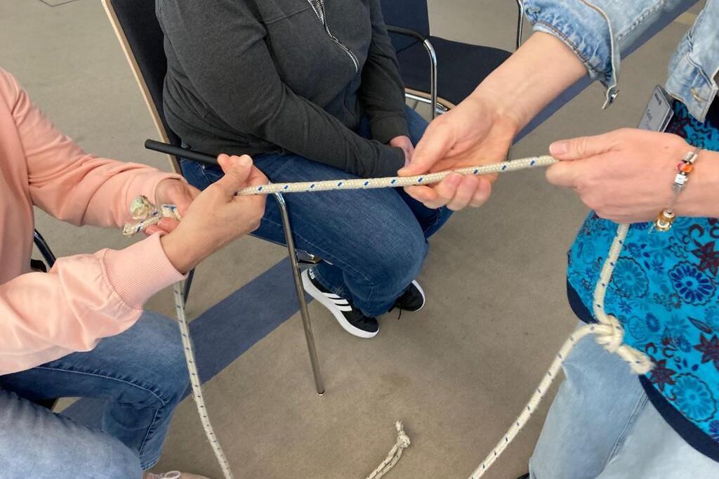 Und dann geht es los mit den Inhalten, die in jedem Erste-Hilfe-Kurs der Johanniter vorkommen. Damit sich alle die wichtigsten Schritte der Ersten Hilfe gut merken können, arbeitet Helga mit einem langen Seil, das sie mitgebracht hat. Bei der Vorstellungsrunde konnten sich die Männer und Frauen einen Gegenstand aus einem kleinen Säckchen nehmen. Jeder Gegenstand steht für einen Baustein der Kette. Zum Beispiel eine Mini-Wärmedecke für Warmhalten. Und ein kleiner Teddy für Trösten und Mut machen. Zu jedem Gegenstand und somit für jeden Schritt macht Helga einen Knoten in das Seil. Am Schluss der Einheit stehen alle im Kreis und halten das Seil und wiederholen die Schritte. "Das macht mir Spaß, dass ich auch Methoden aus der Erlebnispädagogik anwenden kann", sagt Helga.