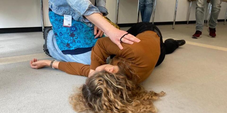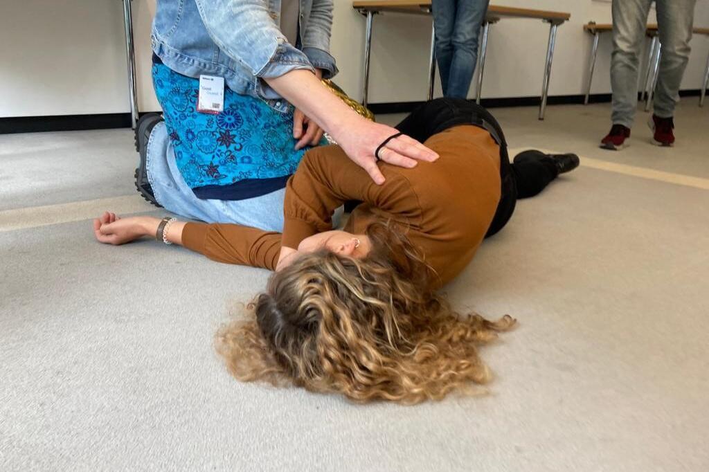 Die Reanimation ist ein wichtiger Schwerpunkt in jedem Kurs. "Wie lange kann man ohne Sauerstoff überleben?" fragt die Trainerin. "Sechs Minuten", vermutet ein Teilnehmer. "Nur wenn Du ein Schnabelwal bist, überlebst Du sehr lange ohne Sauerstoff, Menschen nur 3 Minuten", kommt die Auflösung. Beim Drücken an der Puppe sieht man, dass die Teilnehmenden fast ins Schwitzen kommen, alle strengen sich an. "Ihr macht das super, sehr gut", motiviert Helga die Teams. Sie erklärt auch jeweils die Hintergründe der Maßnahmen, damit die Versicherungsmitarbeitenden als Ersthelfer im Notfall auch improvisieren können. Die stabile Seitenlage ist gar nicht so einfach, welcher Arm ist nochmal oben und unten. Helga führt den Kurs mit Humor, Freundlichkeit und Bestimmtheit. "Magen oben, Mund unten - dann passt alles grob mit der stabilen Seitenlage". In Gruppenarbeiten beschäftigen sich die Männer und Frauen mit den verschiedenen Verletzungsarten und sammeln die Ergebnisse auf Flipcharts.