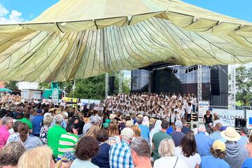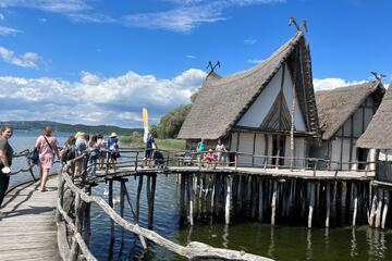„Auf diese Unternehmung freue ich mich ganz besonders, in der Ukraine war ich Lehrerin“, meint eine ukrainische Frau mittleren Alters bevor sie mit anderen Interessierten in eines der Johanniter-Unfall-Hilfe e.V. Gefährte steigt. Fahrtziel ist das Einhaldenfestival, das seit 2003 Künstler*innen mitten im Grünen eine Bühne bietet. Heute haben sich über 200 Grundschüler*innen aus der Region auf dem Podium versammelt, winken im Publikum sitzenden Eltern, Großeltern und Freund*innen zu, treten nervös von einem Bein aufs andere. Musik erklingt, der Kinderchor setzt zu seinem ersten Lied an. Eine Stunde lang singen Kinderstimmen voller Inbrunst Klassiker von Beethoven, eigens für sie neu arrangiert, durchbrochen nur von begeistertem Applaus. „Together“-Teilnehmer*innen wiegen sich im Rhythmus der Musik, die ehemalige Lehrerin tupft sich gerührt Tränen von den Wangen. Über dem Chor schwebt ein Dach aus leichtem Stoff, das vom Wind sanft gebläht wird. Linkerhand locken regionale Spezialitäten zum Verzehr, Salatvariationen, Kuchen und Snacks. „Das Konzert war wunderschön“, sagen eine Mutter und ihre Tochter, die in herzhafte Dinnete beißen. „Eine ganz tolle Atmosphäre“, stimmt eine andere ukrainische Geflüchtete zu. „Wir haben Ausschnitte des Konzertes per Video aufgenommen“, schreibt uns eine schutzsuchende Familie später, „diese schauen wir nun in Dauerschleife in unserer Unterkunft“. Der Schüler*innenchor ertönt noch Tage später, so wird beteuert, aus offenen Fenstern in Ravensburg und im Umland.Pfahlbauten Unteruhldingen
