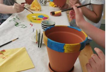 Konzentriert wird der Pinsel in Farbe getunkt und ein blau-gelbes Herz auf den Tontopf gemalt. Blüten, Traktoren, Wolken, Gesichter und Ornamente entstehen auf den Terracotta-Blumenbehältern, die später bepflanzt werden. Zwischendurch ertönt lachen, angeregt wird sich über die kleinen erschaffenen Kunstwerke unterhalten.