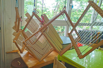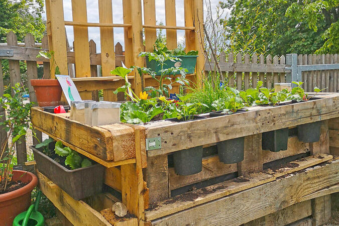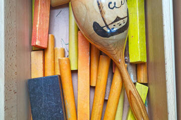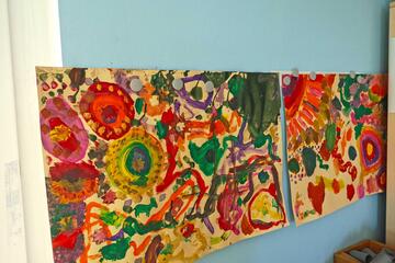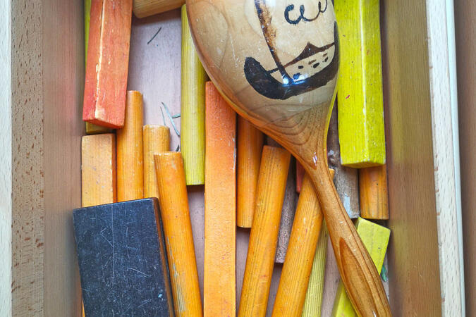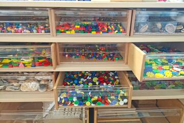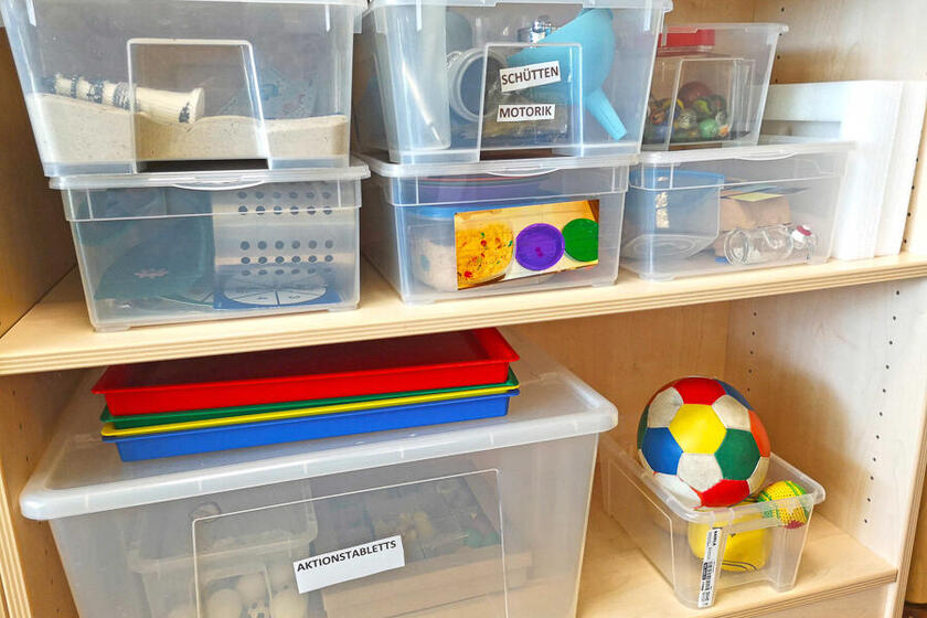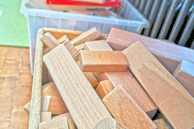 - Wechselnde Aktionstabletts mit Experimenten zu Themen wie Materialdichte, Formen, Gummibandbilder auf Nagelbretter usw.