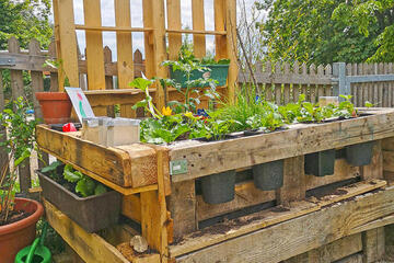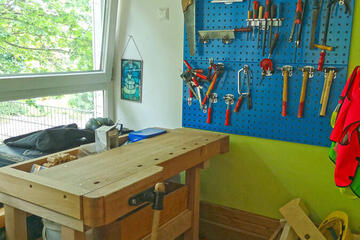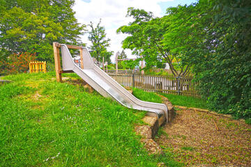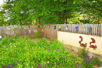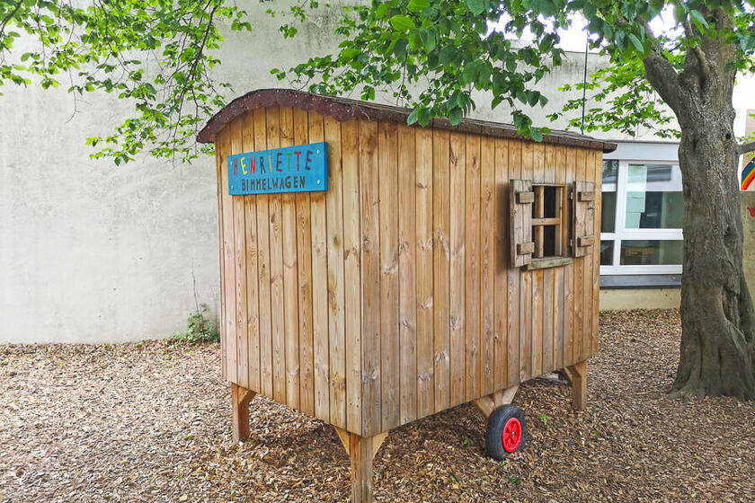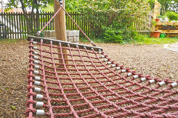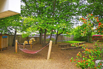 - Ein vielseitig nutzbarer Außenbereich mit Bauwagen, Holzpferd, Feuerstelle, Rutsche und Hängematte