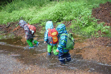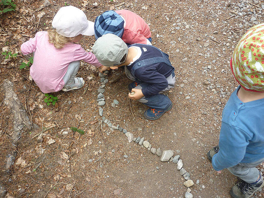 Auf ausgedehnten Spaziergängen, die wir mit fröhlichen Liedern begleiten, entdecken wir immer wieder neue Spielvarianten: wir springen durch Pfützen, verfolgen Tierspuren im Schnee, beobachten Regenwürmer und Käfer, bauen Tipis … der Fantasie sind keine Grenzen gesetzt!