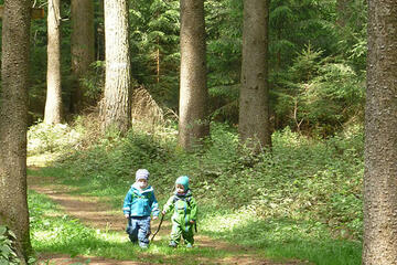 In den wärmeren Jahreszeiten können sich die Kinder auf den nahen Streuobstwiesen austoben. Der Riesenwald ist ein schöner und vielfältiger Entdeckungswald.