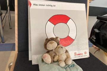 Und dann geht es los mit den Inhalten, die in jedem Erste-Hilfe-Kurs der Johanniter vorkommen. Damit sich alle die wichtigsten Schritte der Ersten Hilfe gut merken können, arbeitet Helga mit einem langen Seil, das sie mitgebracht hat. Bei der Vorstellungsrunde konnten sich die Männer und Frauen einen Gegenstand aus einem kleinen Säckchen nehmen. Jeder Gegenstand steht für einen Baustein der Kette. Zum Beispiel eine Mini-Wärmedecke für Warmhalten. Und ein kleiner Teddy für Trösten und Mut machen. Zu jedem Gegenstand und somit für jeden Schritt macht Helga einen Knoten in das Seil. Am Schluss der Einheit stehen alle im Kreis und halten das Seil und wiederholen die Schritte. "Das macht mir Spaß, dass ich auch Methoden aus der Erlebnispädagogik anwenden kann", sagt Helga.
