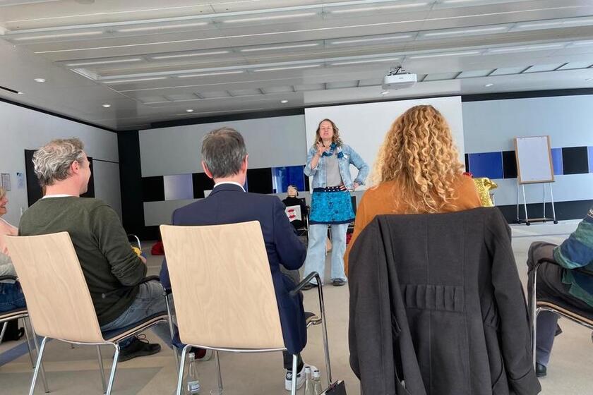 Im dritten Stock angekommen sitzen in einem großen Raum mit modernen Bildern an den Wänden im Halbkreis auf Stühlen rund 15 Männer und Frauen. Die Stimmung ist hier ruhig, manchen unterhalten sich leise. Helga Hedi Denu geht mit Smalltalk auf die Wartenden ein, packt nach und nach die Taschen aus und richtet sich ein. "Technik brauche ich nicht zwingend, mal schauen." Dann geht es los, Helga stellt sich vor den Stuhlkreis und stellt sich vor: "Ich bin Erste-Hilfe-Trainerin bei den Johannitern, neurodivers, Frau mit Migrationshintergrund, Erlebnispädagogin und Papa von drei Söhnen." Und sie erklärt die verschiedenen Methoden, die sie anwenden wird.