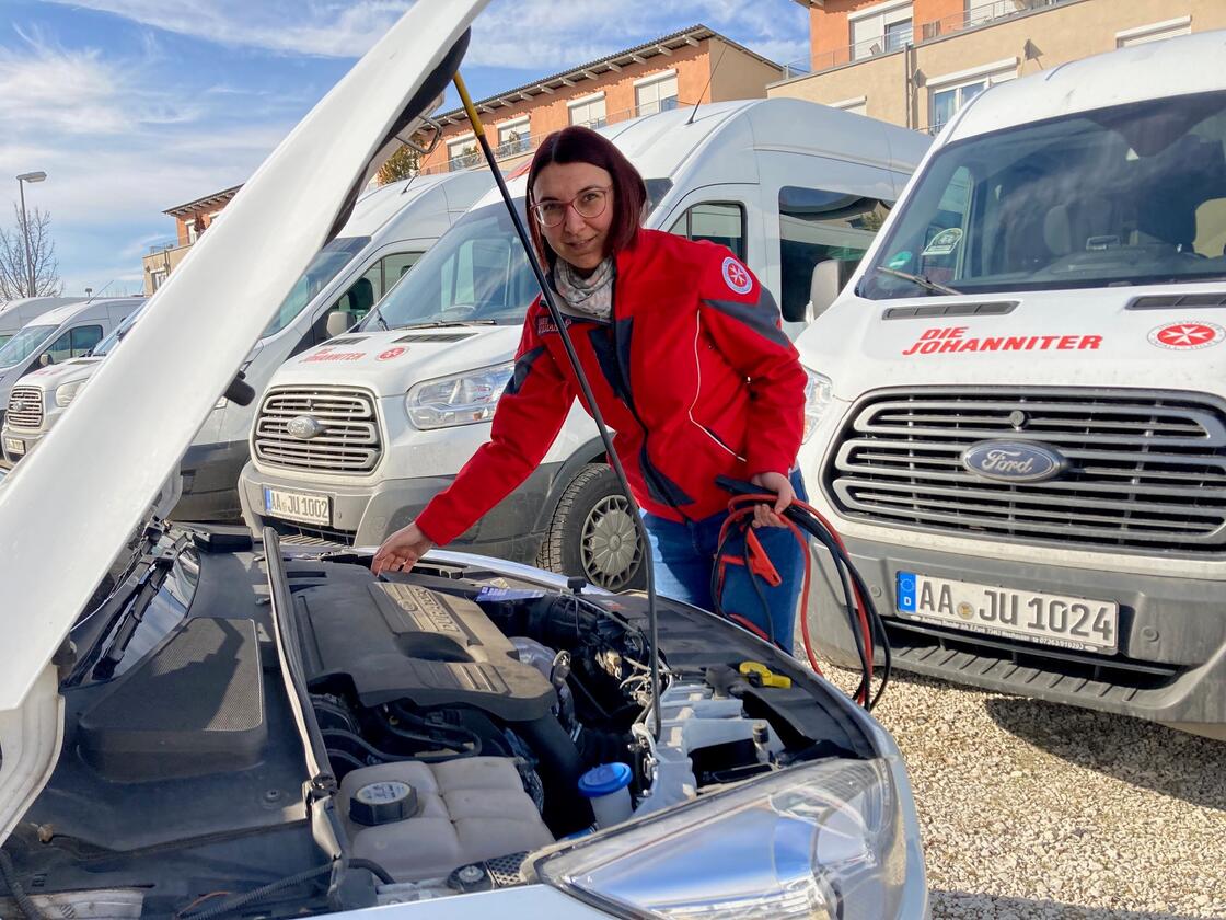 Der große Parkplatz vor dem Gebäude ist voll geparkt mit Bussen und Autos, alle beklebt in rot und weiß, die Fahnen wehen. Es ist klar: Hier sind die Johanniter am Start. Eine junge Frau mit braunen Haaren und strahlenden Augen öffnet die Türe: "Willkommen in Aalen!" Sibel Bahadir ist 30 Jahre alt und Fahrdienstleiterin am Standort Aalen.
