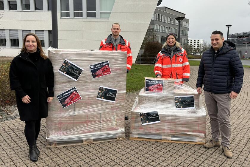 BU: Abholung der Weihnachtstrucker-Pakete bei der Firma Satisloh in Wetzlar v.l. Jennifer Wittmann, Leiterin Human Resources, Satisloh GmbH, Logistiker Laas Barthel von den Johannitern, Miriam Julia Feuerstein, Pressesprecherin der Johanniter im Regionalverband Mittelhessen sowie Geschäftsführer Tobias Armbruster, Satisloh GmbH am Firmensitz in Wetzlar.